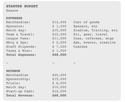 In truth, the budget was a potent mix of hopelessly naive and aggressively risk averse. We didn’t know that soccer at this level would work and we didn’t have any money so we were seriously underfunded. We used the money from the first Memberships we sold to buy our first batch of scarves and to pay for the dome for our tryout. Paycheck to paycheck living, baby!