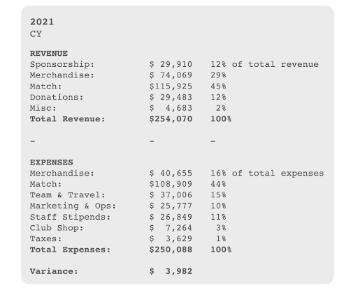 We use the cash accounting method, which means that these numbers reflect the cash that we made or spent. That means that sometimes the numbers can tell white lies, like how we pre-paid for training time we will use in early 2022. That expense hit in 2021–$8,422.92–because we paid for it then but are getting the value of it the next year. Same with the sponsor who paid for their 2022 sponsorship in 2021. That revenue hits the books in December, but is for next season. Merchandise tells an especially confusing story. This time of year we buy a lot of merchandise to have in inventory for the holidays and into the coming year. Since we’re straight cash accounting homie, we don’t have the inventory as assets on our balance sheet. You see just the expenses. We’ll account for the sales as they happen through next year.