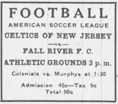 That left the newly-organized Jersey City Celtics at the bottom in 8th place with no wins and no points after 4 matches in the league. The club had given up 20 goals while only scoring 5. Three of those were by their center forward, John Fitzpatrick. On Saturday, October 8, Celtic F.C. visited Fall River United. 1500 were in attendance at the Athletic grounds hoping to see a victory for their home side but they were in for a surprise.