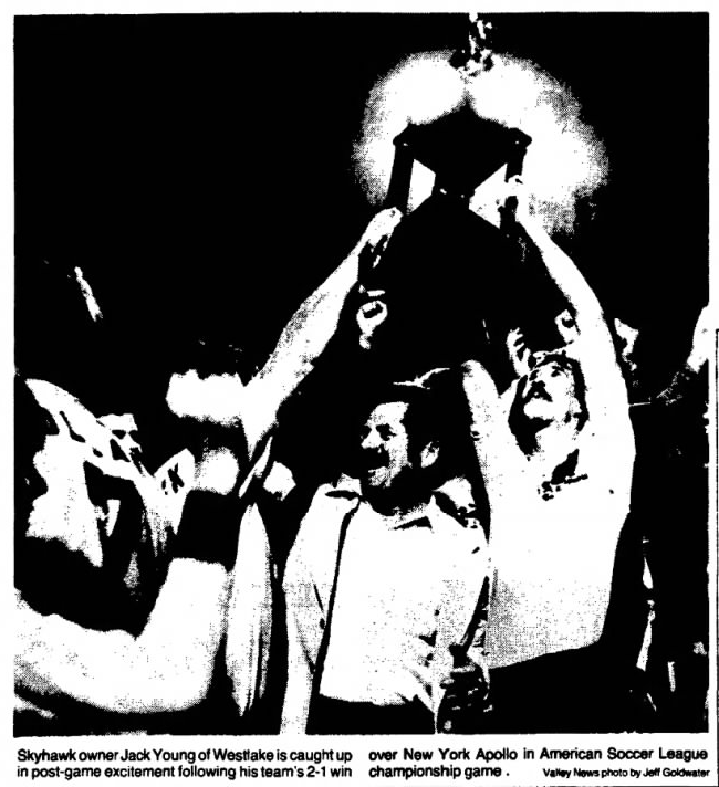 With a franchise formally based in the San Fernando Valley, the Los Angeles Skyhawks were co-owned by real estate developer Jack Young of Westlake Village, and Ralph Smith of Brentwood. The pair hoped to compete with the NASL’s Los Angeles Aztecs and saw the relatively low cost of the ASL as a way to do so. The ASL’s expansion fee of $80,000 was low compared to the NASL’s mid- to high-six figure fees of the time. The ASL’s low salary and overhead costs also appealed to Skyhawks’ owners.