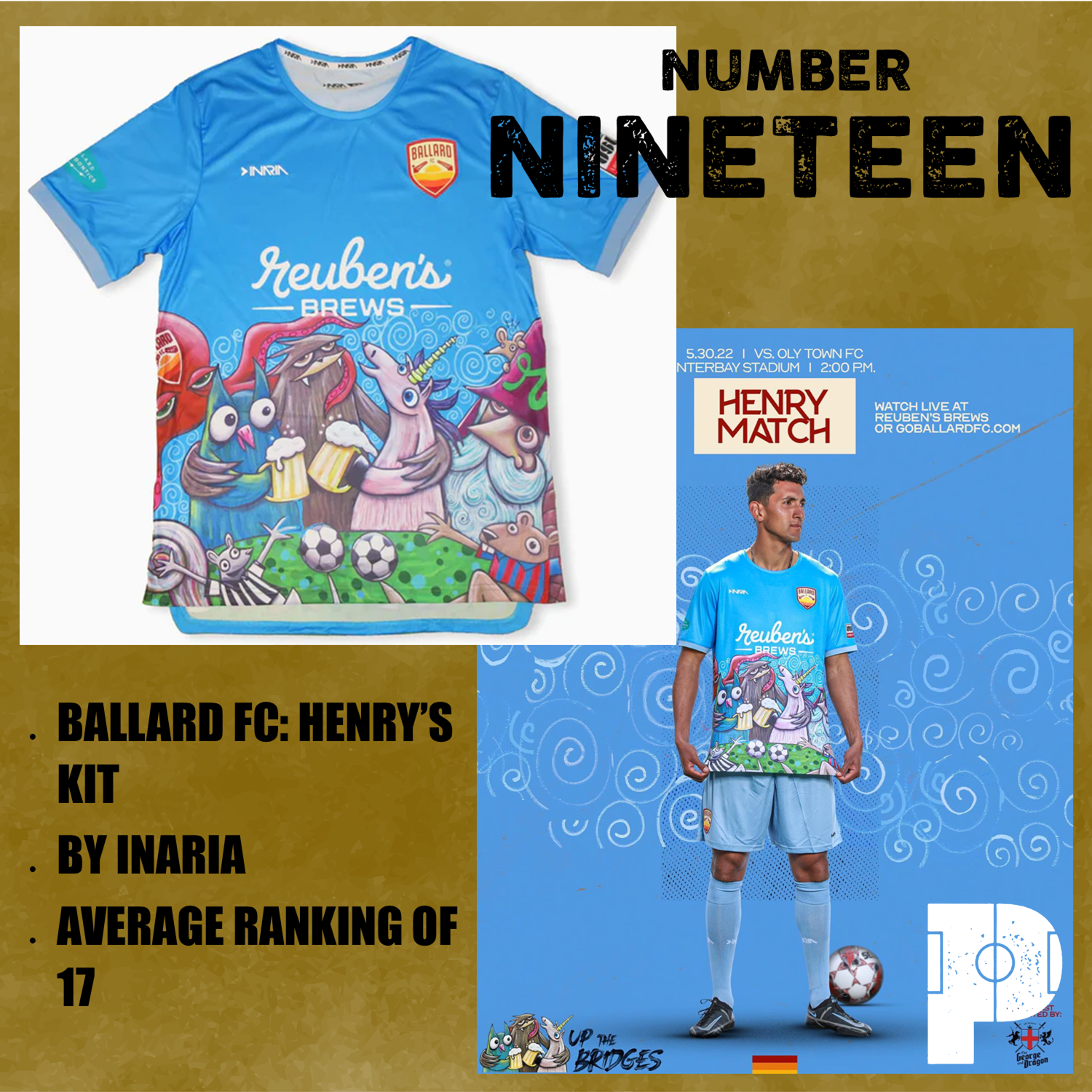 Henry’s Kit, made by Inaria Soccer for Ballard FC, is Number 19