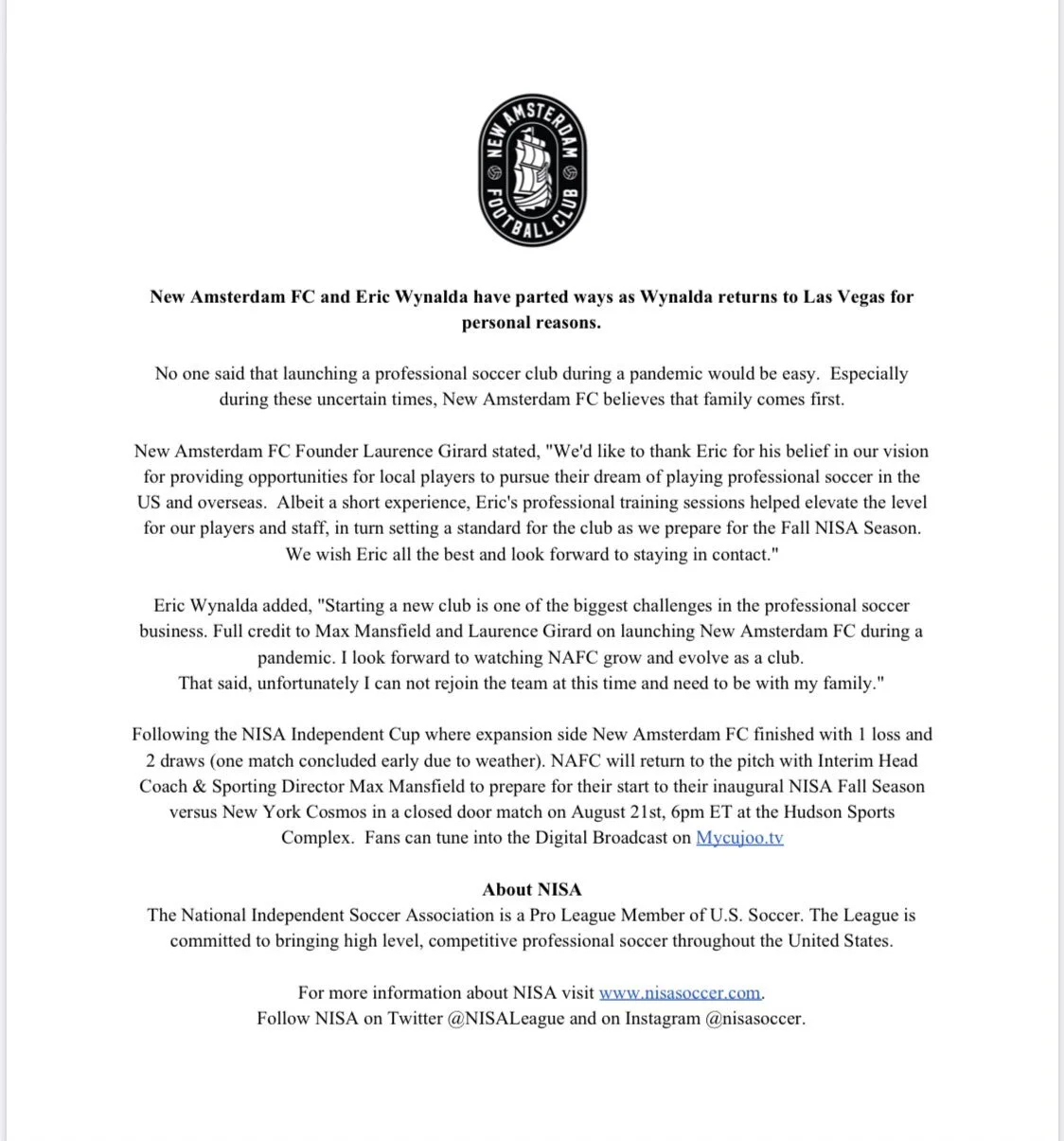 Until this morning anyway, when New Amsterdam announced that Wynalda was leaving the cub for family reasons. Hard to speculate what that means at this point, though it appears to be a mutual agreement between the club and coach. What led to his decision is pure speculation and we won’t participate in that. We fully respect his privacy and wish him well on his new journey. Family health, especially with recent events, is no laughing matter. Already there are trolls making jokes on Twitter and it’s actually pretty disappointing. Guess the clout is more important than the class.